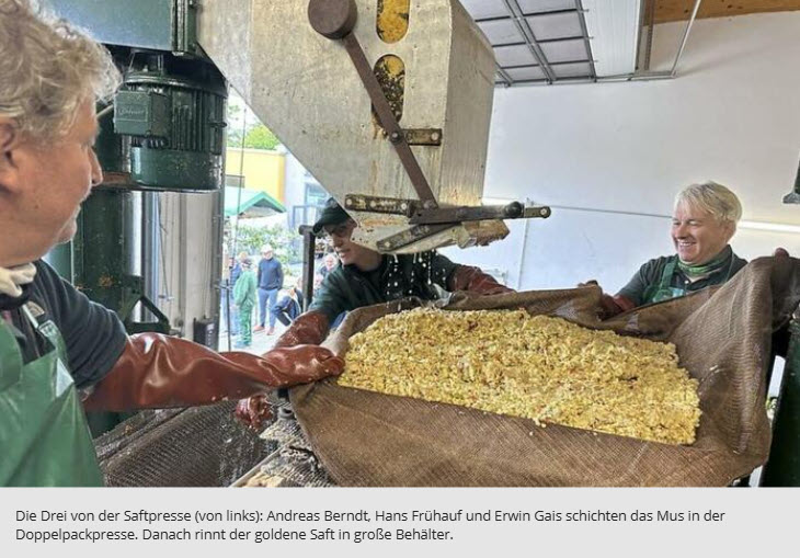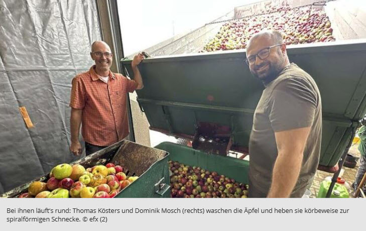 Kirdorf – Die Äpfel glänzen rotbackig in allen Größen im leicht angekippten Hänger. So rutschen die saftigen Früchte direkt in den Wasserbottich. Frisch gepflückt stammen sie von den Bäumen des Kirdorfer Felds. Die Interessengemeinschaft Kirdorfer Feld (IKF) lädt zum 18. Kelterfest – und zahlreiche Besucher sind auch in diesem Jahr wieder mit dabei. Mit lautem Poltern fallen Hunderte Äpfel ins Wasser. Eine Besucherin beobachtet das Geschehen: „Das sieht spannend aus. Das schau ich mir näher an.“ Thomas Kösters und Dominik Mosch waschen die Früchte und heben sie in Körben zur spiralförmigen Schnecke. Dort gelangen sie in den Muser, wo Hans Frühauf, Andreas Berndt und Erwin Gais das Apfelmus schichtweise in die Doppelpackpresse füllen. Wenig später fließt der goldene Saft in große Behälter.