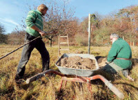 "Wichtig ist die Vielfalt der Sorten", weiß Wimmer. "Äpfel brauchen unterschiedliche Sorten, die sich gegenseitig befruchten. Das heißt, je besser die Befruchtungssituation während der Blüte im Frühjahr durch möglichst viele verschiedene Sorten ist, desto höher ist der mögliche Ertrag im Herbst. Darauf achten wir von der IKF." Zur genetischen Vielfalt der Streuobstwiesen gehören aber natürlich auch andere Obstsorten. Insgesamt wurden sechs Bimen wie die Gute Luise und die Köstliche von Charneu, acht Zwetschen und Mirabellen dazu gehören die Frankfurter Pfirsischzwetschge und die Späte Muskateller Zwetschge, fünf Kirschbäume wie die Prinzessinkirsche und die Germersdorfer Riesenkirsche sowie zwei Quitten und zwei Walnussbäume gepflanzt. Das Wetter hat in den letzten Wochen gut mitgespielt. Weder Schnee noch Regen oder Frost haben der IKF einen Strich durch die Rechnung gemacht. "Wir haben alle Bäume sehr gut in die Erde gebracht", so Wimmer. "Jetzt könnte es ruhig einmal ordentlich regnen." Die Pflanzaktion wurde in diesem Jahr durch die Unterstützung der Ixetic möglich. Als Ersatz für die Versiegelung von Flächen auf dem Firmengelände zum Bau von Parkplätzen hat Ixetic die Pflanzaktion initiiert und möglich gemacht. "Hier ist für die Obstbäume der wesentlich bessere Standort als auf unserem Firmengelände im Gewerbegebiet Süd," sagt Ixetic-Pressesprecher Kajetan Gressler. "Wir sind froh, dass wir diese Aktion hier zum Wohle und zur Entwicklung des Kirdorfer Feldes unterstützen können. Ixetic produziert nicht nur umweltfreundliche Produkte, wir sind auch gerne Landschafts- und Naturschützer." Mit der jetzt durchgeführten Pflanzaktion ist die Zahl der seit 2006, dem Gründungsjahr der IKF, gepflanzten Obstbäume auf über 300 gestiegen. edes Jahr 50 Bäume. Auf diese Weise schaffen wir es, wenn wir so weitermachen, verschiedene Baumgenerationen im Feld aufzubauen. Natürlich, und das macht fast genauso viel Arbeit wie das Pflanzen, müssen die jungen Bäume über mehrere Jahre gepflegt werden. Dazu gehört das Wässern im Sommer, das Graben von Baumscheiben und der Baumschnitt im Winter", sagt Wimmer