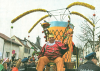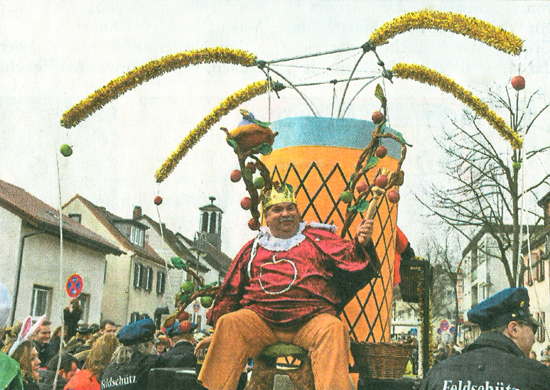Ein wahrer Augenschmaus ist Apfelweinkönig Lothar, der vor einem riesigen Apfelweinglas thront und natürlich immer wieder einen Schluck aus einer kleineren Version mit richtigem "Stöffche" nimmt. Den Schluss des Zugs bildet ihre Lieblichkeit, Prinzessin Tanja I., die gewohnt strahlend einen ihrer letzten Auftritte bei der diesjährigen Fastnacht bewältigt.