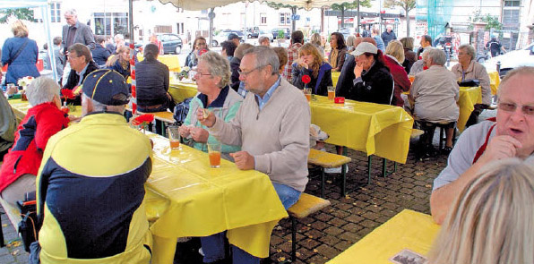 Es war nicht genau zu eruieren, was die Menschen mehr in den Kirdorfer Ortskern lockte: Der Äppler in allen denkbaren Varianten vom Saft bis zum Prosecco, die hausgemachten Kuchen oder die Wildschweinwürste, die mittags im Handumdrehen über den Tresen gingen. Auch die Prominenz ließ es sich nicht nehmen, den neuen Äppler zu probieren: Bürgermeister Karl Heinz Krug mit Gattin Elke Barth und SPD-Fraktionsvorsitzendem Jürgen Stamm waren begeistert und mussten immer wieder die Luft aus den Gerippten lassen, um nicht auf dem Trockenen zu sitzen.