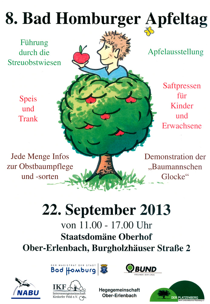 Unter Beteiligung der Hegemeinschaft Ober-Erlenbach, Interessengemeinschaft Kirdorfer Feld, BUND, NABU und dem Verein Landschaftsschutz Platzenberg findet der nunmehr 8.Apfeltag am Sonntag, den 22. September 2013, in der Staatsdomaine Oberhof (Ober-Erlenbach, Burgholzhäuser Straße 2) statt. In der Zeit von 11 bis 17 Uhr werden an den Informationsständen der beteiligten Naturschutzorganisationen und -vereine neben vielen Informationen rund um den Apfel und andere Obstsorten, insbesondere Tipps zur Anlage, zur Pflege, zum Erhalt und zur Nutzung von Streuobstwiesen gegeben. Es werden regionale Spezialitäten und natürlich Apfelwein angeboten. Ein besonderes Highlight ist in diesem Jahr die Vorführung der sogenannten "Baumannschen Glocke", mit welcher der frische Süße zur schonenden Haltbarmachung in wenigen Sekunden auf 75 Grad erhitzt und sofort wieder heruntergekühlt wird. Natürlich gibt es auch wieder die beliebten Führungen durch die Streuobstwiesen und vieles mehr.