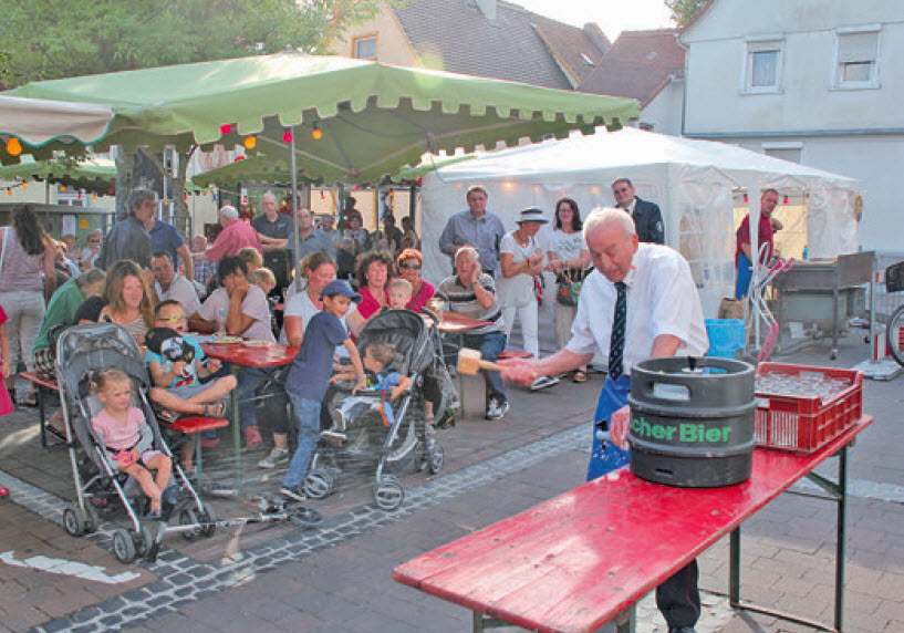 Der Bornplacken, wo das Fest stattfand, war stets gut besucht. Eröffnet wurde das Stadtteilfest mit dem Fassanstich durch den Ehrenwehrführer der Freiwilligen Feuerwehr Kirdorf Karl Schlott zu den Klängen der Spielmannszüge des CV Heiterkeit und der Freiwilligen Feuerwehr Kirdorf und des Spielmannzugs des CV Heiterkeit, bei dem auch die Garde des Karnevalvereins auftrat. Vielleicht war Karl Schlott durch die Gardemädchen abgelenkt, denn er brauchte zig Schläge, bis der Zapfhahn eingeschlagen war. Zudem versickerten einige Liter des Gerstensafts im Bornplacken aber dann konnte er doch den Durst der Festbesucher mit Freibier löschen. "Ich hab' sowas noch nie gemacht" verkündete der Ehrenwehrführer, "darauf trinken wir einen!".Anschließend wurde das "Kirdorfer Preisrätsel" ausgespielt, bei dem es Apfelsecco von der IKF zu gewinnen gab. Am Sonntag begann das Stadtteilfest mit dem Frühschoppen, bei dem der Kolpingchor einmal das "Appelwoilied" anstimmte. Auch der Gesangverein "Geselligkeit" und der Club Humor sorgten am Vormittag für Stimmung unter den Besuchern. Am späten Nachmittag begannen die Wettspiele um den Wanderpokal im Fünfkampf. Hier hatte sich Hans Leimeister, der Vorsitzende des Vereinsrings Kirdorf, etwas Besonderes einfallen lassen. Da das Stadtteilfest unter dem Zeichen des 125jährigen Jubiläums der Freiwilligen Feuerwehr Kirdorf stand -kurz zuvor wurde im benachbarten Heimatmuseum die Ausstellung dazu eröffnet- standen die Wettspiele auch im Zeichen der örtlichen Feuerwehr. Die fünf Teilnehmer Waltraud Wehrheim, Elias Gutjahr, Eberhard Zettlitzer, Uwe Griesel und Dirk Dittmann mussten zunächst so viel Wehrführer beziehungsweise Feuerwehrhauptmänner nennen, die es in Kirdorf gab. Dann war etwas Geschicklichkeit angesagt, denn ein kleiner Ball musste durch eine runde Öffnung in einen Karton geworfen werden, um an einen Kerzenlöscher zu gelangen, mit dem drei Kerzen gelöscht werden sollten. Anschließend mussten die Teilnehmer mit einem Weinheber Wasser ansaugen und dann drei Pommesschalen von einem Biertisch blasen. Einfacher war das gleiche Spiel, nur mit einer Wasserspritze, die per Hand aufgepumpt wurde. Auch hier mussten drei Pommesschalen vom Biertisch gespritzt werden. Zum Schluss kam noch ein historischer Löscheimer aus Hanf zum Einsatz. Hier waren 70 Meter mit dem Löscheimer zu einem Wasserhydranten zu laufen. Der Eimer wurde gefüllt und zurück ging es