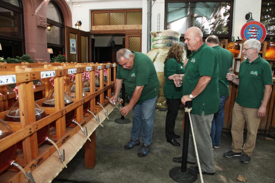 Frankfurt. Golden schimmert es aus 20 Glasballons. Mit Kennermiene treten die Verkoster heran, halten ihr Geripptes unter den Schlauch, lösen die Klemme und lassen den nächsten Schoppen einlaufen. Nur zwei Finger hoch; hier geht es ums Verkosten. „Am Freitag habe ich meinen, glaube ich, ’rausgeschmeckt“, sagt Thomas Villwock. Er ist der amtierende Apfelweinkönig der Interessengemeinschaft Kirdorfer Feld (IKF), hat am Freitag auf dem Verkostungszettel unter „Bemerkungen“ notiert: „Meiner!“Gestern war er mit sechs Vereinskollegen im „Lorsbacher Thal“, um noch einmal zu verkosten. So sicher war er sich diesmal nicht: „Das fällt selbst bei der kleinen Menge schwer.“