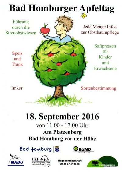 Am Sonntag, 18. September, lädt die Stadt Bad Homburg gemeinsam mit dem Verein Landschaftsschutz Platzenberg, der Hegemeinschaft Ober-Erlenbach, der Interessengemeinschaft Kirdorfer Feld, dem BUND und dem NABU zum Apfeltag am Platzenberg in Bad Homburg ein.Von 11 bis 17 Uhr gibt es an den Informationsständen der beteiligten Vereine und Naturschutzorganisationen viele Informationen rund um den Apfel und andere Obstsorten. Mit Werner Nussbaum ist ein Pomologe vor Ort, der Obstsorten bestimmt und Auskunft zur Obstbaumpflege gibt. Imker Manfred Rubel erklärt die Imkerei und ihre herausragende Bedeutung für Natur und Landwirtschaft. Honig und andere Erzeugnisse der Bienen können probiert und gekauft werden.