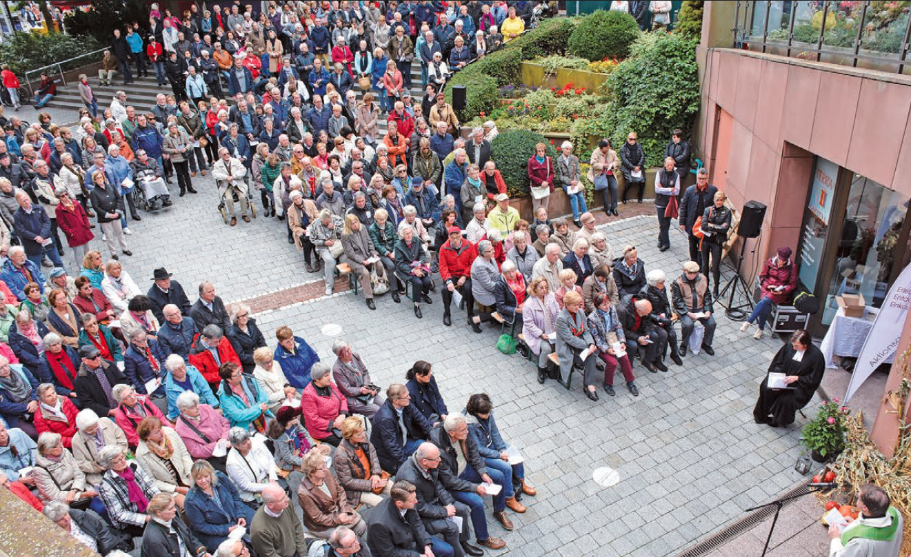 "Möge die Straße uns zusammenführen und der Wind in deinem Rücken sein; sanft falle Regen auf deine Felder und warm auf dein Gesicht der Sonnenschein." Passender hätte der Liedtext aus dem ökumenischen Erntedankgottesdienst nicht sein können. Trotz wechselhaften Wetters war die Innenstadt Bad Homburgs beim Erntedankmarkt der Aktionsgemeinschaft brechend voll.