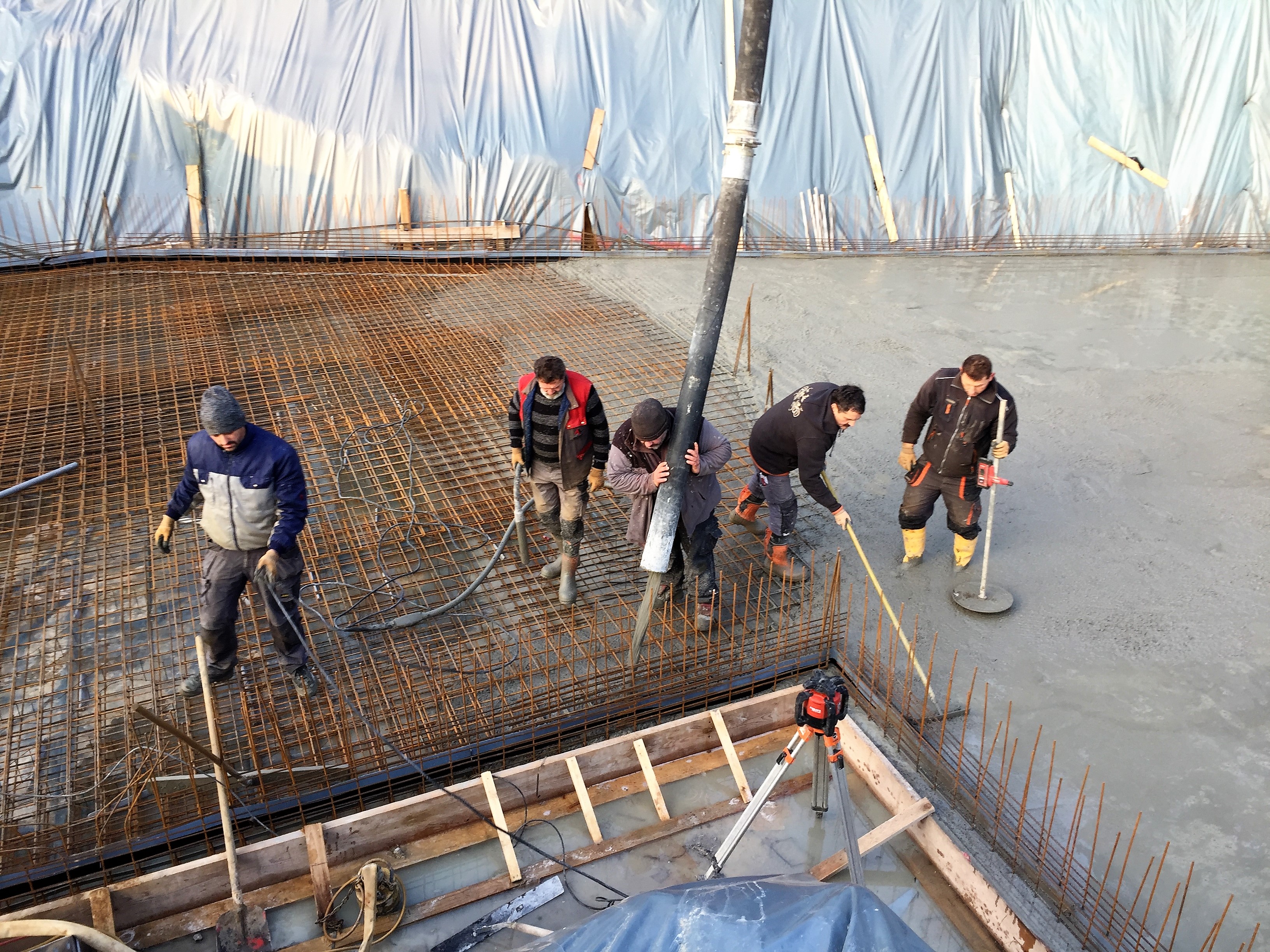 Am 7. Februar haben endlich der Statiker und der Prüfstatiker die Freigabe für das Gießen der Bodenplatte erteilt. Bereits um 7:30 Uhr stand dann am 8. Februar der erste Lastwagen an der Betonpumpe auf unserer Baustelle. Mit einem 35 m langen Ausleger wurde der Beton vom Lkw in die Grube gepumpt.