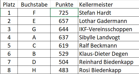 Nun, bei der Auszählung setzten sich dann zwei Apfelweine vom restlichen Feld ab und bildeten die Spitzengruppe: Die Stöffche E und F von Stefan Hardt und Lothar Gadermann waren schnell weit vorne; direkt gefolgt vom "IKF-Vereinsschoppen". Das "Herzberg-Stöffche" von Ralf Beckmann hielt sich wacker im Mittelfeld.
