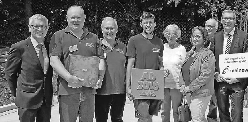 Bad Homburg (hw). "Üblicherweise spricht man ja von Grundsteinlegung- wir sind allerdings bedingt durch das schlechte Wetter im Winter etwas spät dran", sagte der Vorsitzende der Interessengemeinschaft Kirdorfer Feld (IKF), Fred Biedenkapp, bei der Begrüßung der kleinen Gästeschar am Wochenende auf der IKF-Baustelle am Usinger Weg. " Deshalb sprechen wir auch besser von einer Grundsteinsetzung." Der von der Kirdorfer Steinmetzfirma Gunther Seiffert gesponserte Grundstein ist ein handwerkliches Meisterstück aus Sandstein - von Sebastian Schaller von Hand gefertigt. Er trägt die Aufschrift AD 2018 und das Logo der IKF. Am Abgang zum Keller verschließt der Grundstein eine kleine Nische, in die Biedenkapp zuvor die Zeitkapsel eingesetzt hatte. In der Zeitkapsel befinden sich die aktuelle Mitgliederliste und die Satzung der IKF. je ein Exemplar der Taunus Zeitung, der Bad Homburger Woche und der Frankfurter Rundschau sowie ein "Geripptes". "Damit man auch in 100 Jahren noch weiß, wie wir heute unseren Äppler getrunken haben", sagte Biedenkapp.