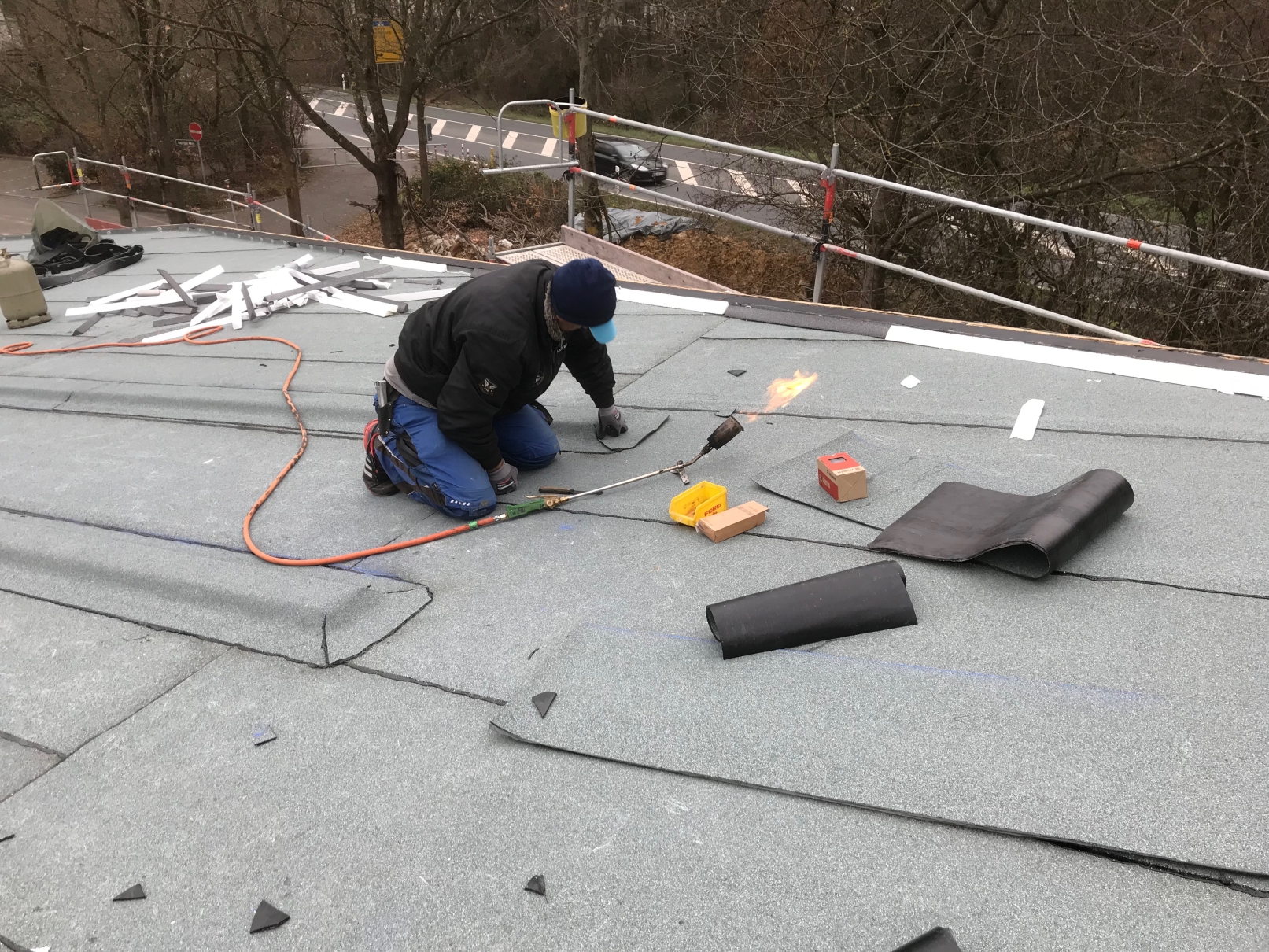 Dank dem vorweihnachtlichen Einsatz der Dachdecker der Fa.Löw konnte, gerade rechtzeitig vor dem ersten Schneefall, das Dach der neuen IKF-Halle abgedichtet werden. Die Arbeiten gestalteten sich trotz der "eigentlich" geraden Dachfläche etwas aufwändiger, denn es mussten sowohl in der Dachdämmung als auch in der äußeren Dachhaut die Befestigungsbalken für die Solaranlage integriert werden. Diese sind nun, solange die Solarpanel noch fehlen, wie Kuppeln auf dem Dach erkennbar.