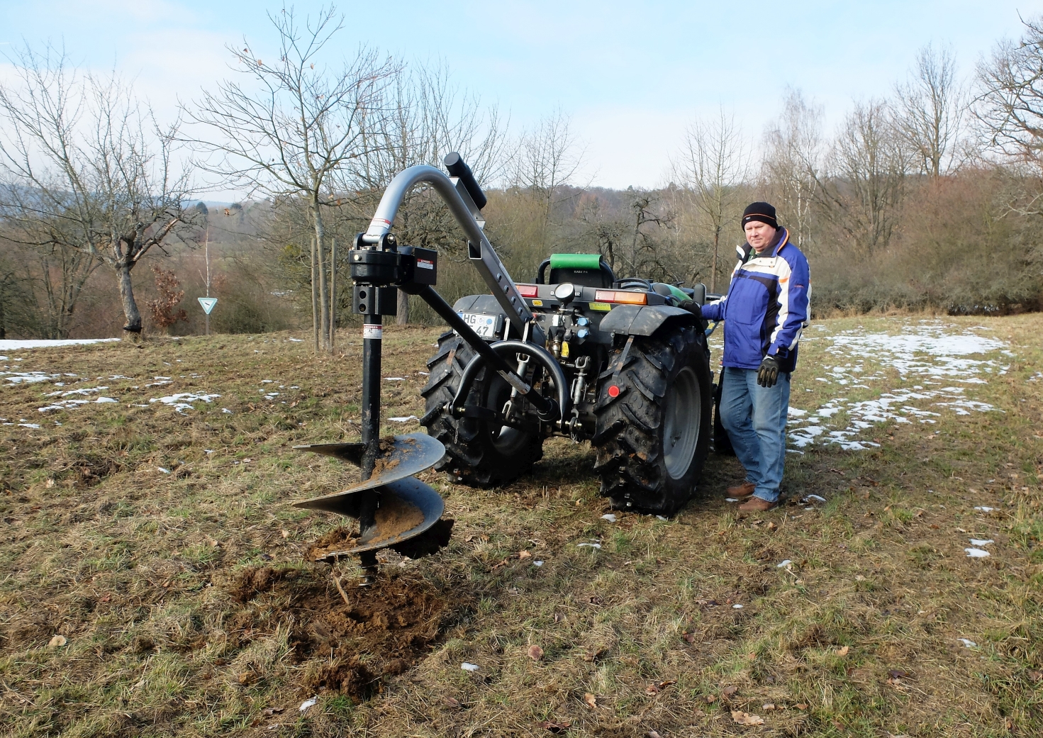 Anfang Februar hat sich die IKF zum Pflanzen neuer hochstämmige Obstbäume im Kirdorfer Feld einen Erdbohrer angeschafft. Diesen haben Fred Biedenkapp und Michael Korwisi, nachdem er am Traktor montiert worden war, gleich ausprobiert. Bis Ende Februar sollten nämlich 40 hochstämmige Apfel-, Birnen-, Zwetschgen- und Mirabellenbäume in die Erde.