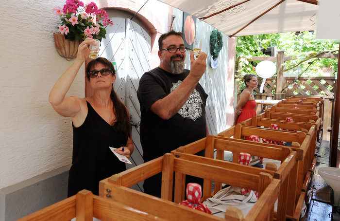 Auch der Organisator der Meisterschaft, Jockel Döringer, war am Ende des dreitägigen Test-Trinkens mehr als zufrieden: "Die Qualitäten sind in diesem Jahr phantastisch, ins Glas kommen eben nur die Besten der Besten." Die tropische Hitze hatte zwar einen noch größeren Menschenauflauf im "Alt Orschel" verhindert. 31 Tester waren es trotzdem, und rund um die im Eisbett stehenden Ballons mit den Proben herrschte ständig reger, kommunikativer Betrieb, denn die Test-Trinker diskutierten im Kollegenkreis jeden Schluck. Laien konnten viel über den goldenen Trunk vom hohen Ast lernen und mit den aufgeschnappten Erkenntnissen angeben . . .