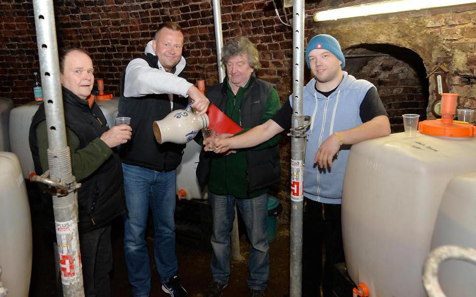 An der Tür zum Eiskeller hängt das Kränzchen mit dem Bembel – das Zeichen, dass die Verkaufsstelle für den Kirdorfer Apfelwein geöffnet hat. Kopf einziehen, ein paar Meter durch den engen Gang, dann steht man im etwa 50 Quadratmeter großen Gewölbe unter dem Kirdorfer Schwesternhaus, das um 1870 herum als Eiskeller aus Feldbrandsteinen gemauert wurde. Unter idealen Bedingungen gärt und lagert die Interessengemeinschaft Kirdorfer Feld (IKF) hier seit acht Jahren den Apfelwein, den der 300 Mitglieder starke Verein im Herbst aus den Früchten der Streuobstwiesen gekeltert hat.
